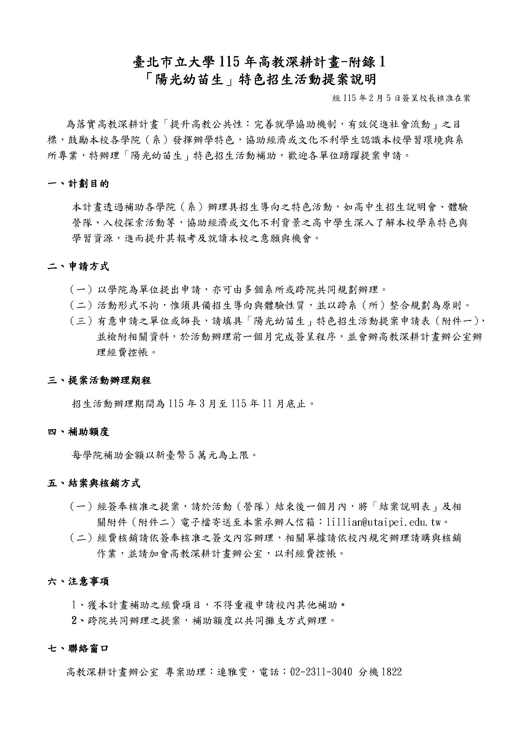 【高教深耕計畫】115年「陽光幼苗生」特色招生活動提案說明